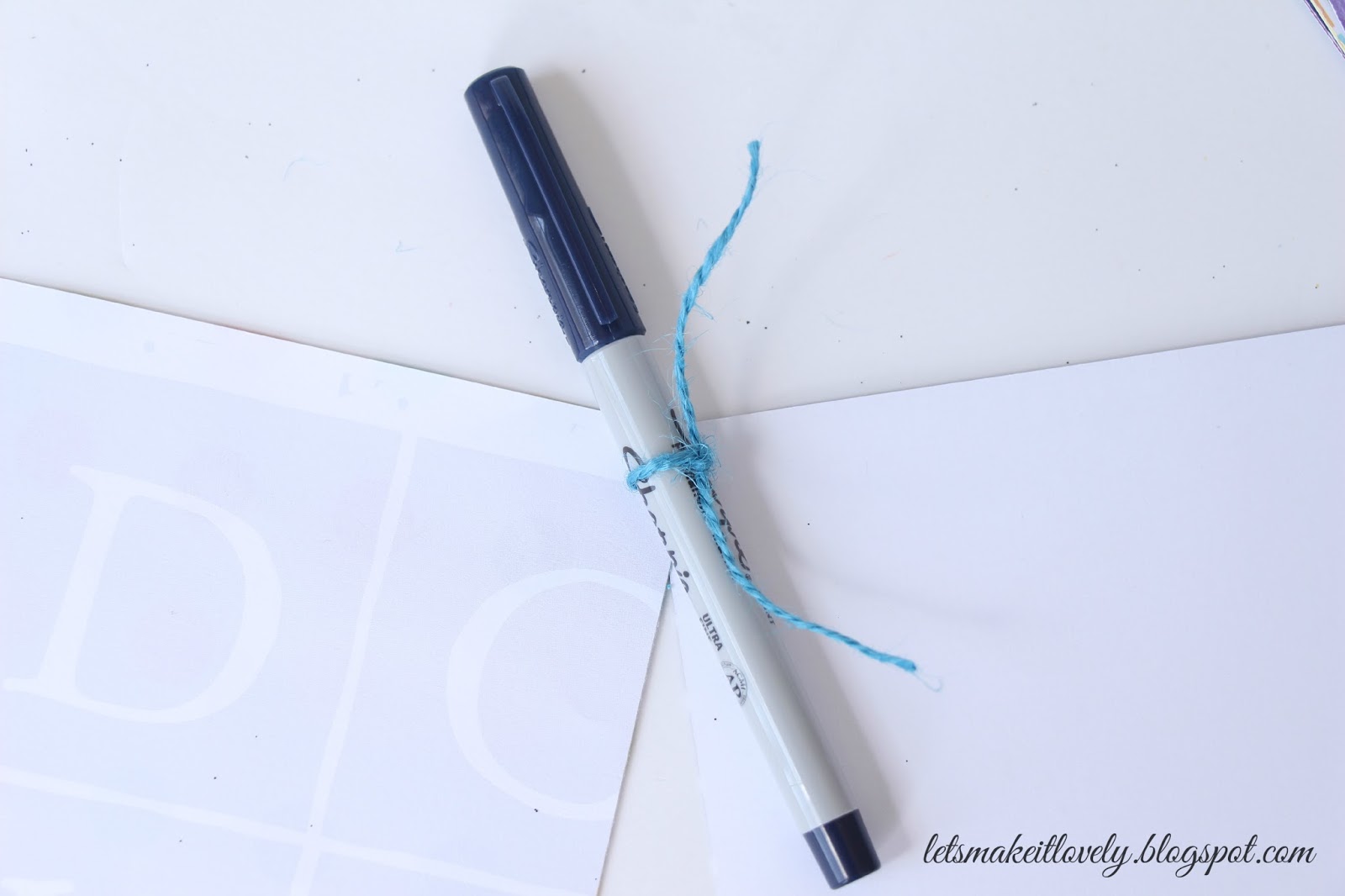 Tie the alphabet flags together using a thread and making sure you keep alphabets in correct order. Often when you punch holes at corners and try to tie them together with a thread, the paper will be ripped in the process of tightening the knot. Here is a little trick I invented. Get the thread through the holes, place a pen (or anything similar) and knot the thread tight. Once you are done knotting, remove the pen. Try it!